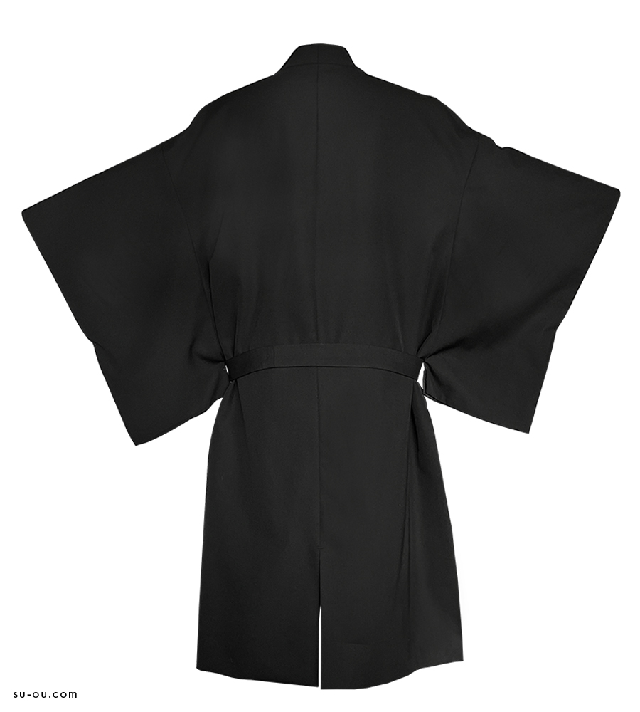 (サイドとバックにスリットを入れ、襟の裏に付属したスプリングホックで前を留められる仕様にした羽織。ウール生地を使用。共布で、帯を付属。)